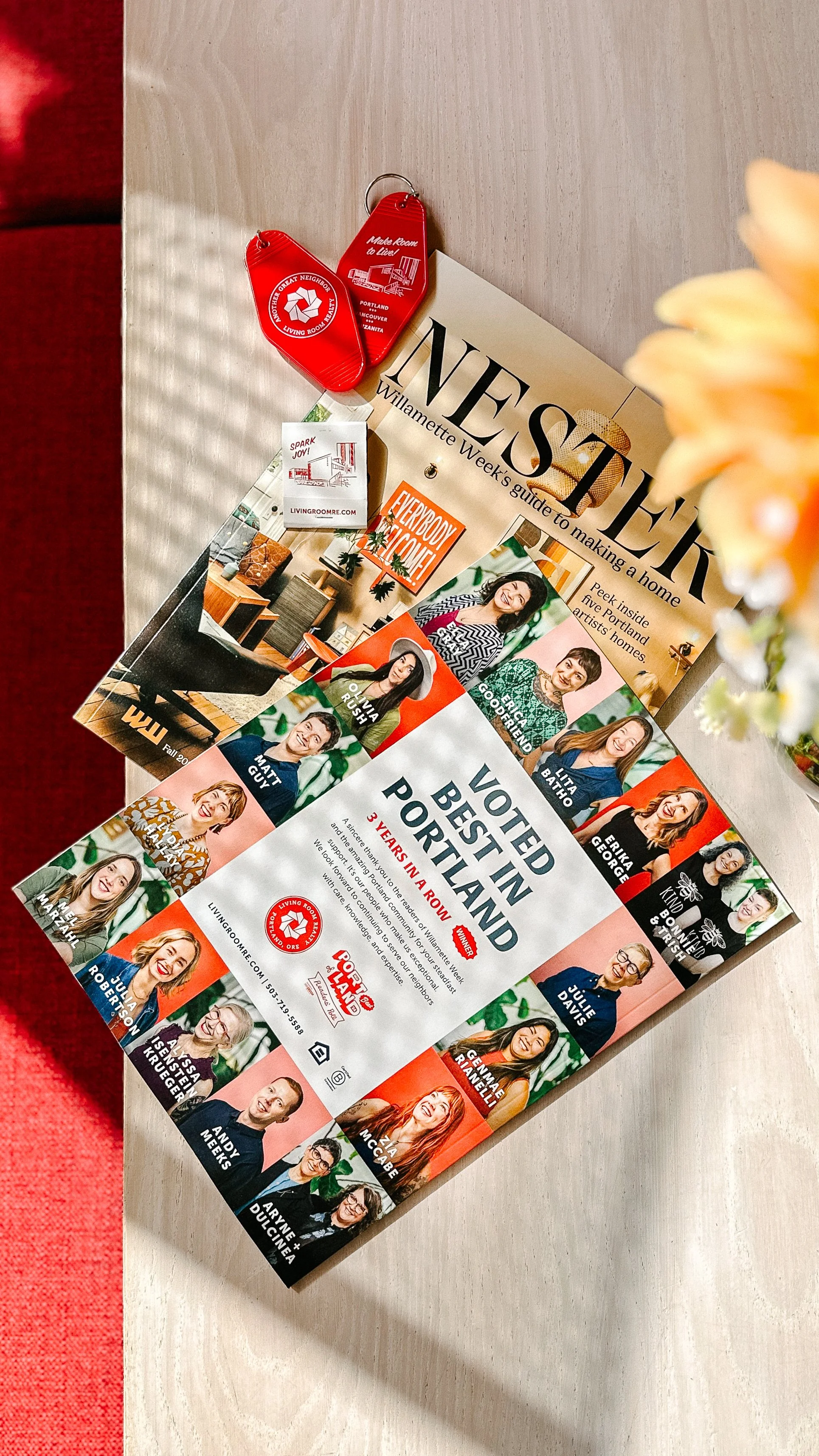 From matchbooks to T-shirts, we’ve designed a range of swag that captures the spirit of Living Room Realty—thoughtful, fun, and community-focused.